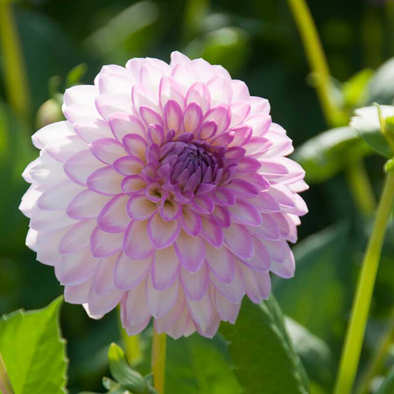 En vacker dahlia med vita kronblad och lila kanter. Den är idealisk som snittblomma. Dahlior är lättskötta och bekymmersfria växter som kan leva länge om knölarna tas om hand på hösten.