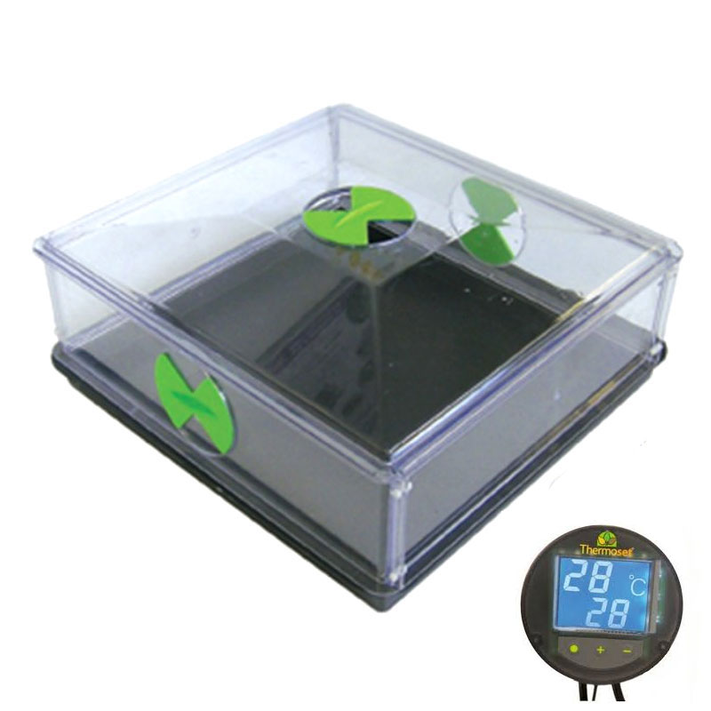 Vitopod levereras med justerbara ventiler för optimal luftfuktighet och den digitala termostaten möjliggör exakt värmeinställning mellan 5°C och 30°C. Den uppvärmda modellen är särskilt lämpad för vinterodling av bladgrönsaker och tidig frösådd.