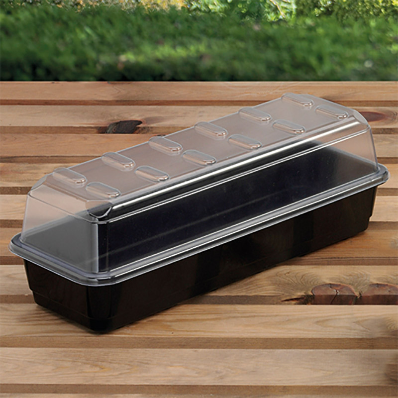 Ett enkelt men hållbart miniväxthus i en praktisk storlek till ett mycket bra pris. Perfekt för frösådd och sticklingar. Får enkelt plats på fönsterbrädan. Botten har hål för dränering så man kan så och plantera direkt i den. Håller vanligen i 2 till 3 säsonger. Tillverkad av 100% återvunnen plast. Storlek: L37,5 x B13,5 x H12,5 cm. Färg: Svart.