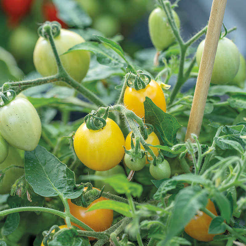 Funnyplums Orange’ F1 är en kompakt körsbärstomat med ett dekorativt utseende, perfekt för balkongen. Denna tomatplanta, som har ett upprätt växtsätt, klarar av värme och trivs bäst på soliga platser. Blommorna liknar små paraplyer ovanför bladverket, och de plommonformade tomaterna ligger som ett vackert, orange täcke över bladen. Frukterna, som mognar från grönt till guldgult, är lätta att skörda och kräver ingen tjuvning eller uppbindning.