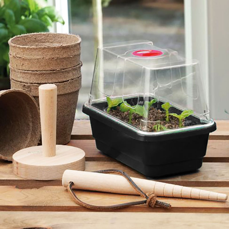 Minidrivhuset Mini är ett elegant litet miniväxthus med en hög kupa tillverkat i robust kvalitet och med justerbar ventilation. Det är perfekt för mindre sådder och när du behöver rädda en eller två sticklingar där du behöver hålla hög luftfuktighet. Den svarta bottenmodulen har hål för dränering och mäter L17 x B10 x H12,5 cm.