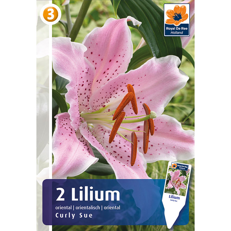 Höjd, cm: 90 Färg: Rosa Blomningstid: juli-aug Läge: sol-halvskugga Planteringstid: mars-juni Vetenskapligt namn: Lilium Orientaliska gruppen ‘Curly Sue’ Antal per förpackning: 2 Storlek lök/knöl: 14/16
