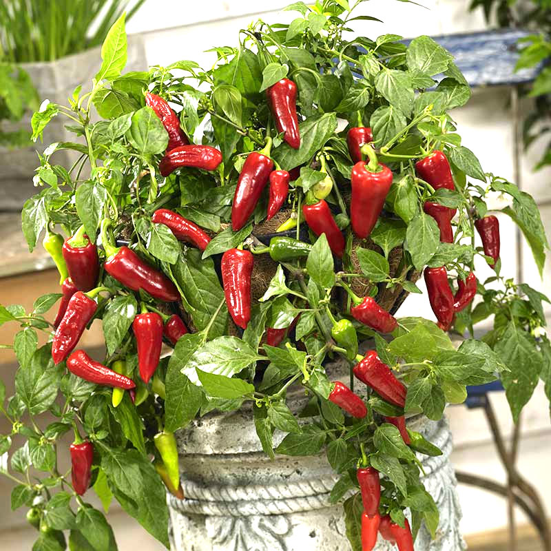 Denna hängande paprika har stora, lysande röda frukter och är en fantastisk sort att odla. Den passar perfekt för odling i amplar och större krukor.