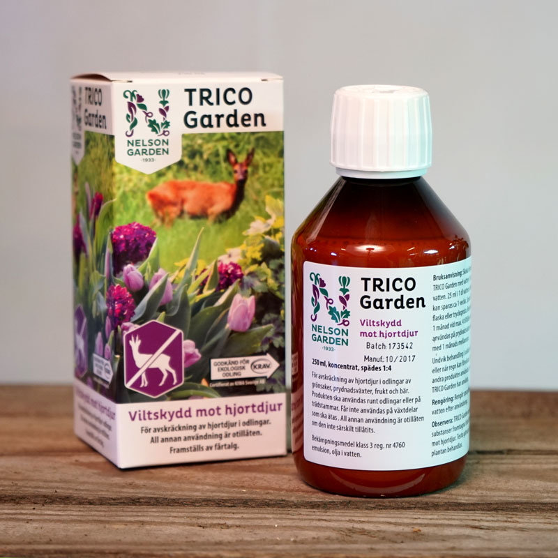 TRICO Garden är ett KRAV-godkänt medel baserat på fårtalg, som effektivt håller hjortdjur borta från prydnadsväxter, grönsaker, frukt och bär. Produkten ger långvarigt skydd och kan användas hela året.