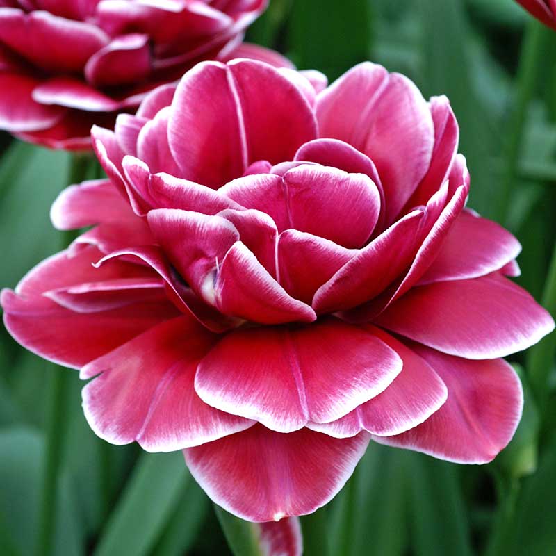 En läcker och imponerande tulpan med vit, elegant bård som fångar ljuset vackert. Den tillhör de dubbla, sena tulpanerna och är långlivad, både i rabatten och i vasen.