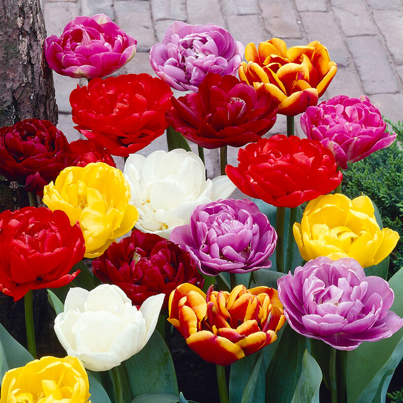 En mix av senblommande dubbla tulpaner i blandade färger, som inkluderar gul, lila, orange, röd, rosa och vit. Blommorna har en fylld och pinliknande form, vilket ger dem ett unikt och iögonfallande utseende. De når en höjd på cirka 40-45 cm.